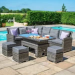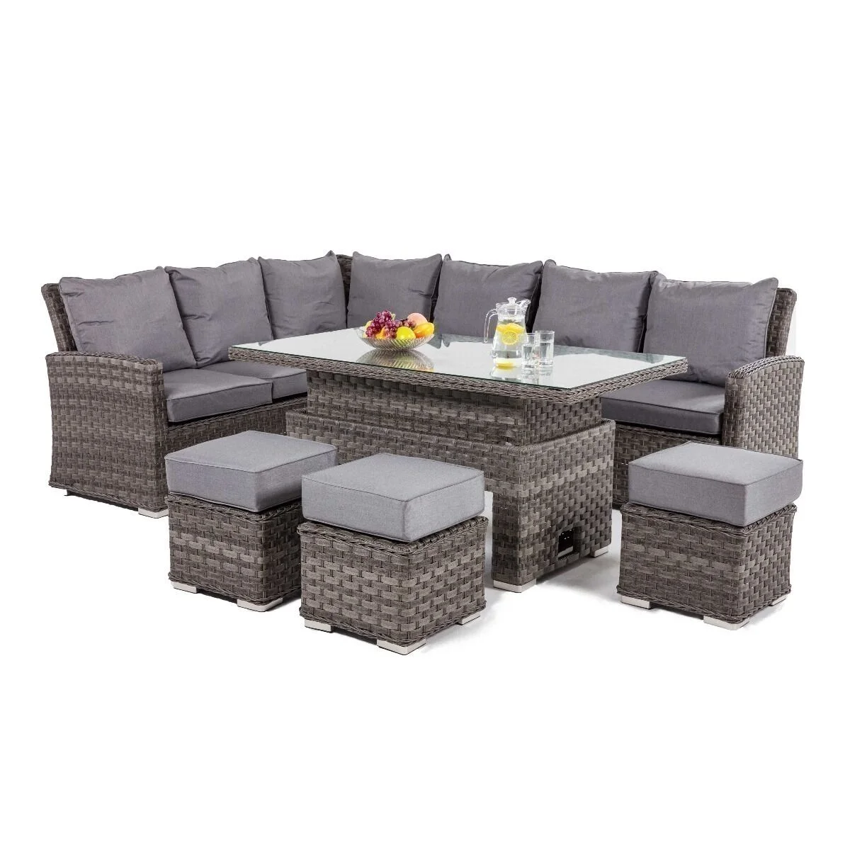 The Victoria Kingston Corner Sofa Dining Set is the perfect way to combine relaxation with comfortable dining and has now been further improved with the addition of a rising table. This table provides great versatility for your outdoor space. In addition, the rising table will allow you to go from dining to lounging as it transforms from a dining table to coffee table with ease.